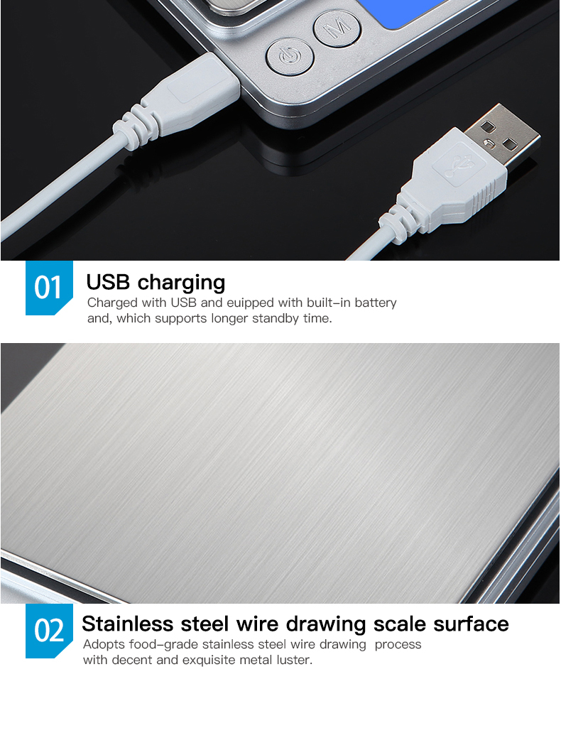 USB Charging; Stainless Steel Wire Drawing Scale Surface Counting Function for More Convenient Weighing